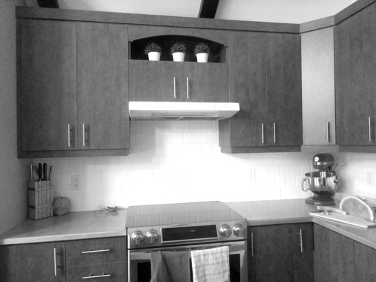 Notre cliente souhaitait une cuisine moderne, fonctionnelle et sur-mesure, avec du rangements et une touche déco.
